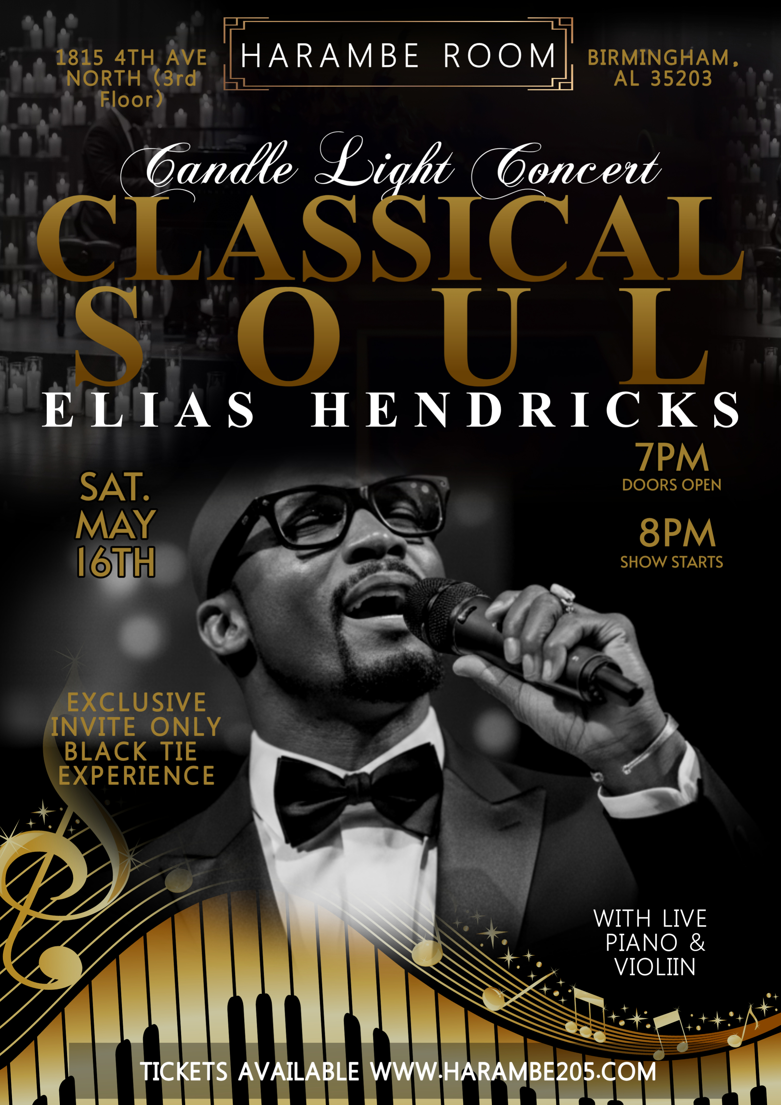 Join internationally acclaimed vocalist Elias Hendricks for an unforgettable black-tie evening in Birmingham's intimate Harambe Room. Classical Soul is where opera technique meets soul authenticity. From classical arias to reimagined soul classics, this is not a concert—it's an experience.